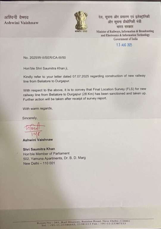 বেলিয়াতোর থেকে দুর্গাপুর পর্যন্ত নতুন রেললাইন তৈরির পথে গুরুত্বপূর্ণ পদক্ষেপ নিল কেন্দ্রীয় রেল মন্ত্রণালয়। কেন্দ্রীয় রেলমন্ত্রী অশ্বিনী বৈষ্ণব সংসদ সদস্য সৌমিত্র খাঁ-কে চিঠি দিয়ে জানিয়েছেন যে বেলিয়াতোর থেকে দুর্গাপুর পর্যন্ত ২৮ কিলোমিটার দীর্ঘ নতুন রেললাইনের জন্য ফাইনাল লোকেশন সার্ভে (FLS) অনুমোদন করা হয়েছে এবং কাজ শুরু হয়েছে।